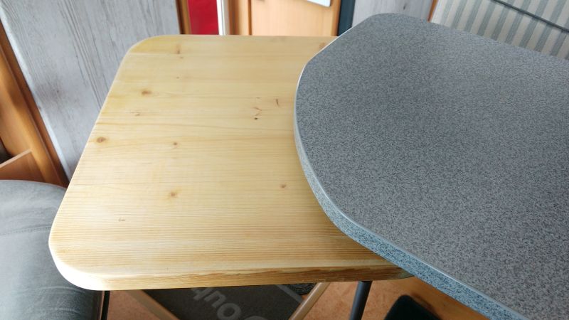 Bis wir wieder los können muss ich was am Womo basteln! Schon lange geht mir die Konstruktion einer ausdrehbaren Tischverlängerung durch den Kopf. Hierfür gibt es spezielle Tischfüsse. Die sind mir aber zu teuer! Für 17,- € habe ich einen Drehbeschlag aus Kunststoff, Tragkraft 200 kg, mit einem Durchmesser von 280 mm gefunden. Die Tischplatte hatte ich noch liegen.