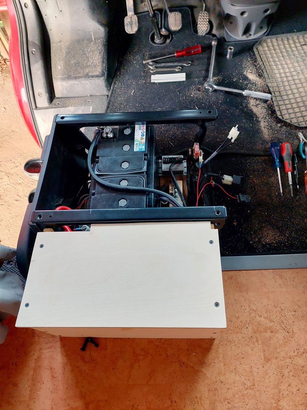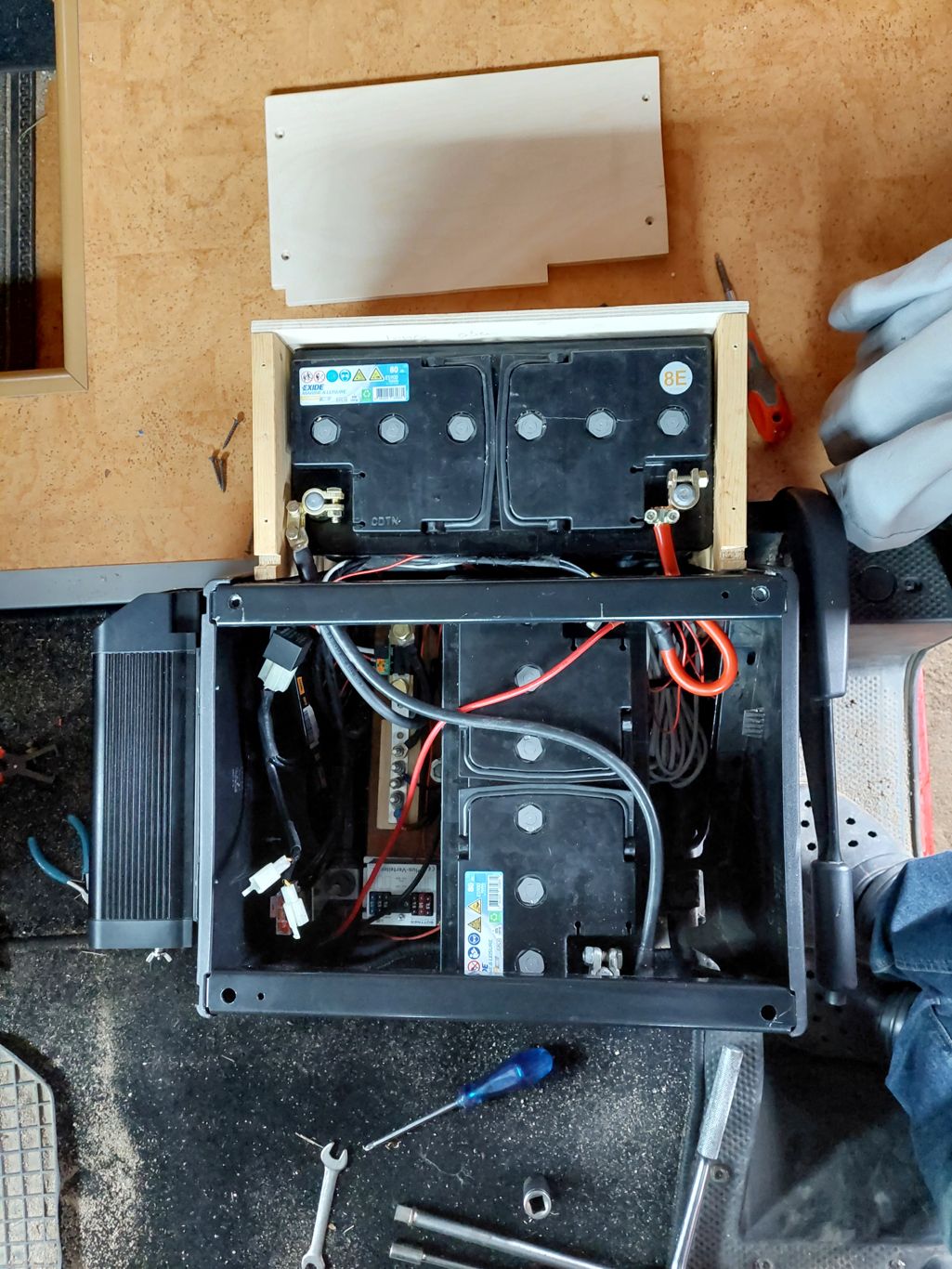 Wohin mit der zweiten Batterie: In das Gestell des Fahrersitzes passt sie nicht. In die Sitztruhe der Dinette würde sie genau reinpassen, aber die Anschlusskabel werden mir zu lang. Also kommt sie direkt hinter den Fahrersitz und wird mit Holz verkleidet.