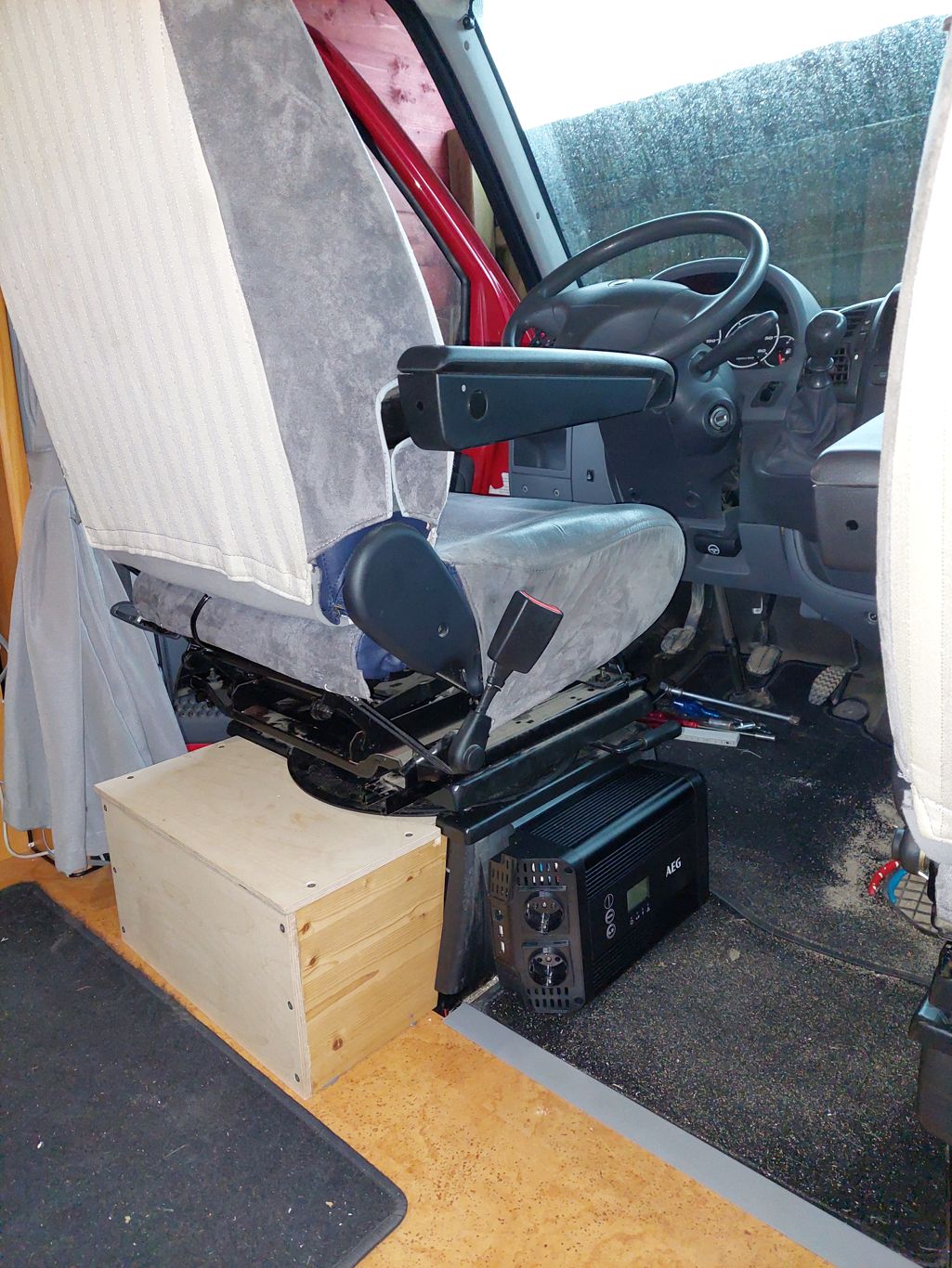 … und noch einen Wechselrichter! 600 Watt reichen aus, damit können die Akkus der E-Bikes geladen werden – wie weit dann die Kapazität der Batterien noch reicht muss sich zeigen! Er passt genau an die Seite unterm Fahrersitz.