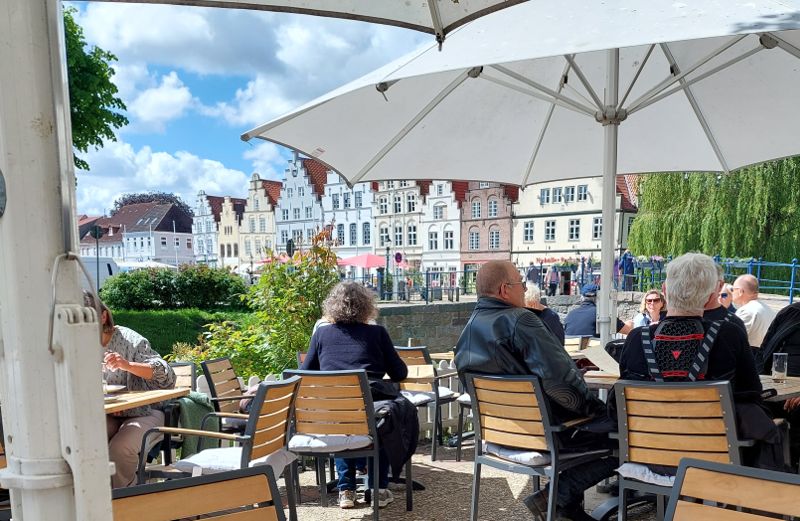 Wir radeln nach St. Peter-Bad, Sabine muss Shoppen. Leute gucken und Futter gibt's in Die Insel. Es ist lange nicht so voll wie in Büsum und die Atmosphäre ist angenehm.