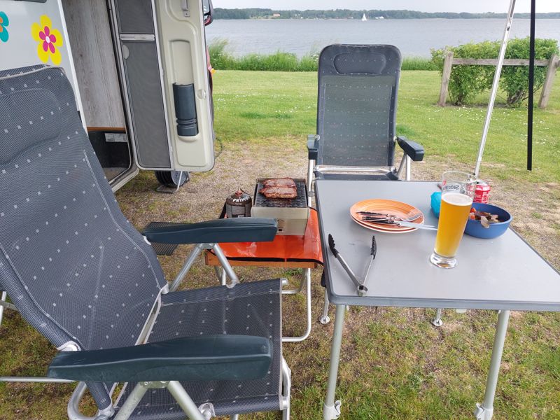 Zum Mittagessen wollten wir eigentlich in den Postgaarden, die Nr. 1 am Ort. Geschlossene Gesellschaft, eine Hochzeit. Also Einkaufen bei Super Brugsen und dann leider wieder grillen 🙂👍
