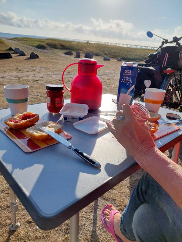 Die nahe Autobahn über die Storebælt Brücke hat in der Nacht doch schon genervt, leider haben wir für 2 Nächte bezahlt und in die City von Nyborg wollen wir heute auch noch.