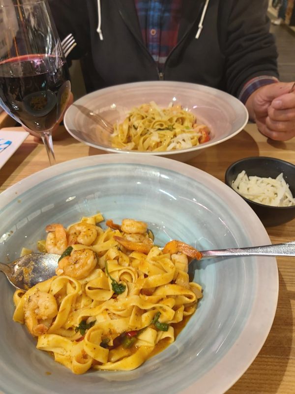 Es geht zum Shoppen in die Hallen am Borsigturm, aber keine Beute. Zum Trost geht’s zum Tresen Italiener, Pasta Scampi und Lachs, lecker!