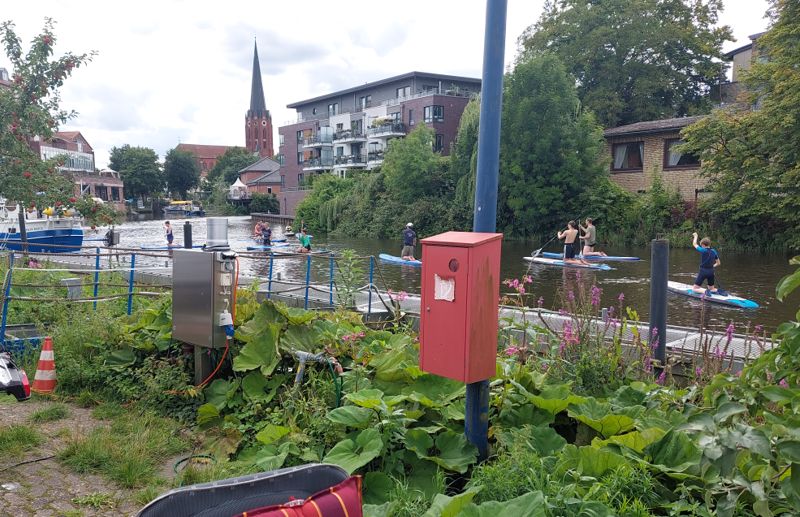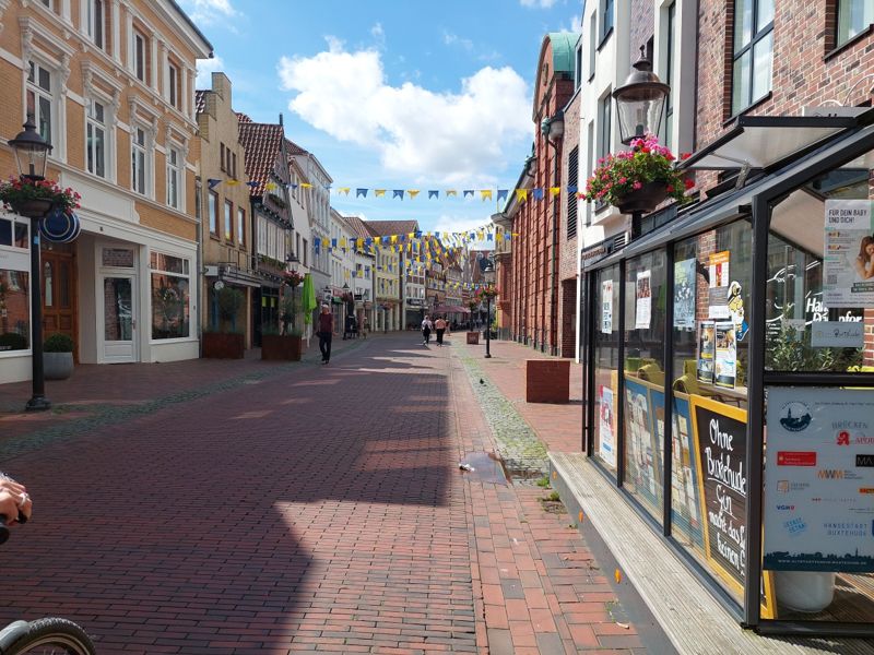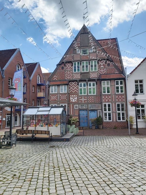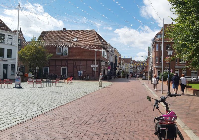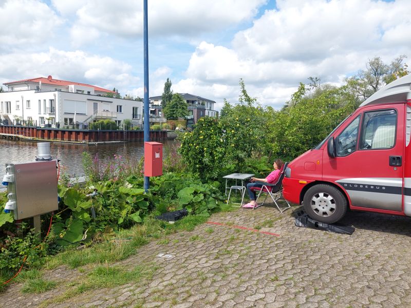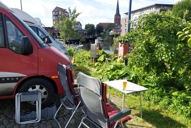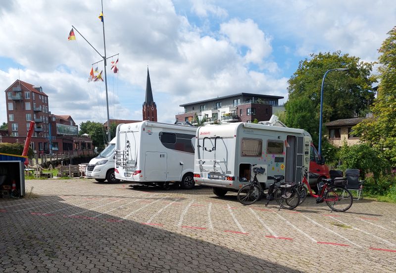 Um kurz nach 09:00 Uhr ist Start. Wir kommen ohne Stau gut durch und landen gegen 11:00 Uhr in Buxtehude. Hier gibt es 2 Stellplätze, einen kleinen für 10 Mobile direkt im Hafen am Rand der Altstadt und einen großen auf dem Schützenplatz. Wir haben Glück und bekommen einen Platz im Hafen, der ist zwar recht schief aber mit nettem Blick aufs Wasser. Das Areal ist von einem hohen Zaun umgeben. Am Zufahrtstor hängt eine Telefonnummer. Man bekommt dann den Code fürs Schloss und einen Platz zugewiesen. Für die Gebühr von 15,00 € gibt es Umschläge, die man ausgefüllt in einen Briefkasten steckt. In dem Betrag ist auch Strom, Dusche und WLAN enthalten.