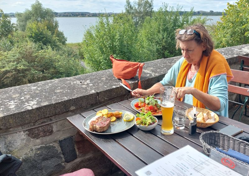 Gleich nebenan ist ein tolles Restaurant „Am Kap“ mit Blick auf den Unteruckersee. Das Rumpsteak und das Hokifilet waren köstlich.