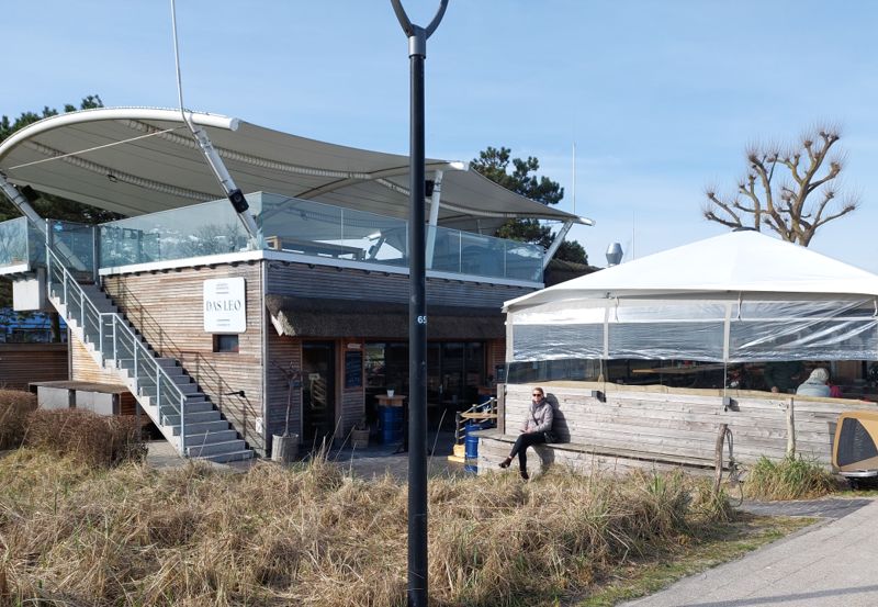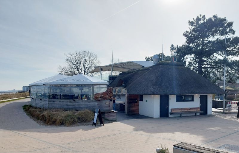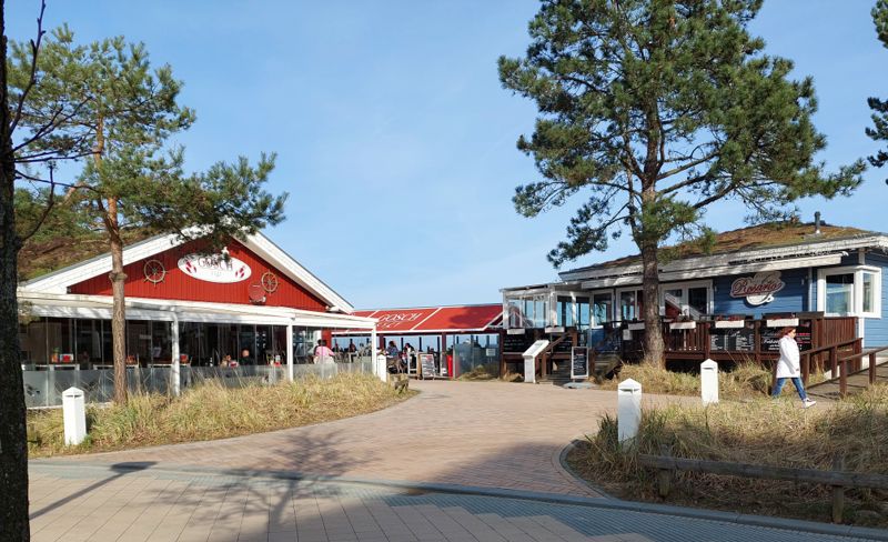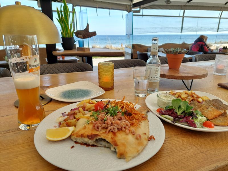 Mittag gibt’s im Das Leo, direkt am Strand. Meine Scholle ist eine 2-, Sabines Dorsch eine 3.