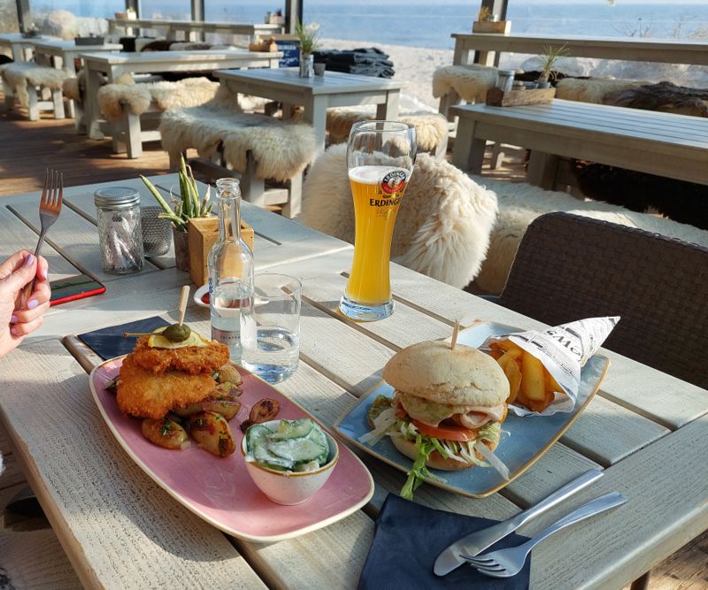 Mittag essen wir im Beach House, Burger und Schnitzel, 3+ und 3-.