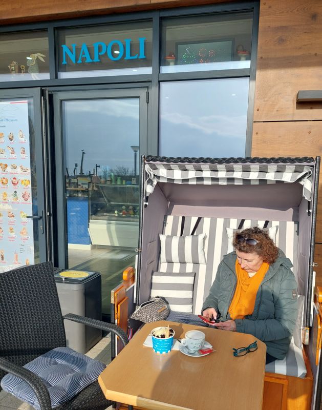 Nachmittags fahren wir in die City. Unser Lieblingsrestaurant „Fien tu Huus“ existiert leider nicht mehr!!! Der nicht sehr viel versprechende Laden heißt jetzt „Strandlächeln“, davon gibt’s auch noch welche in Meschendorf und Hohenfelde.