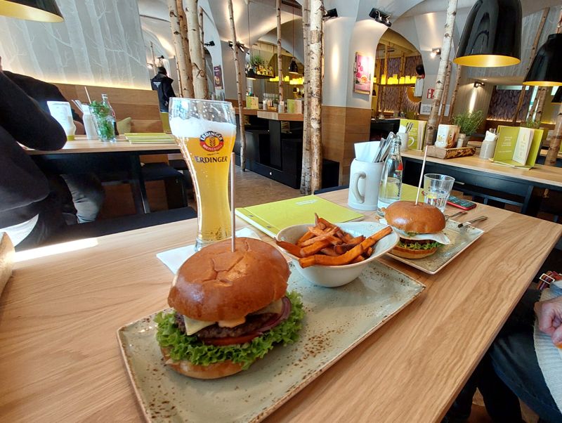 Mittag essen wir im Burger-Grill Hans im Glück. Mein Western Burger mit Süßkartoffeln und Sabines veganer Burger mit einem Walnussbratling waren sehr lecker, beide eine glatte 2+.