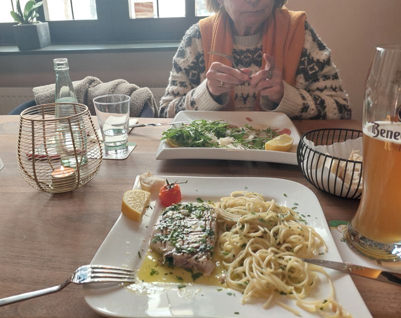 Wir radeln durch den Ort, Mittag gibt’s in der Trattoria La Posta. Mein Thunfisch mit Spaghetti war eine 3, ganz gut, aber es fehlte der Wumms. Sabines Carpaccio war gut, eine 2, ihr Panna cotta auch.