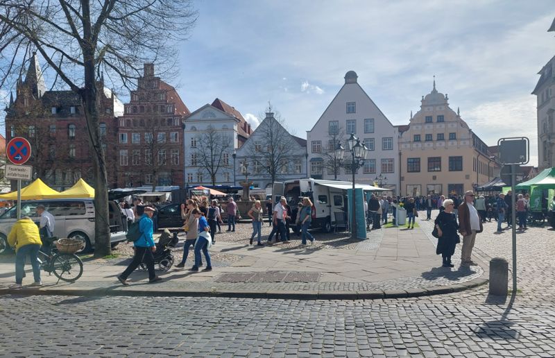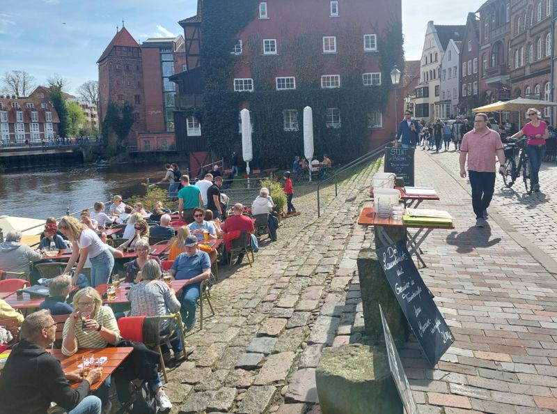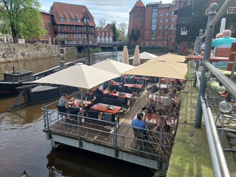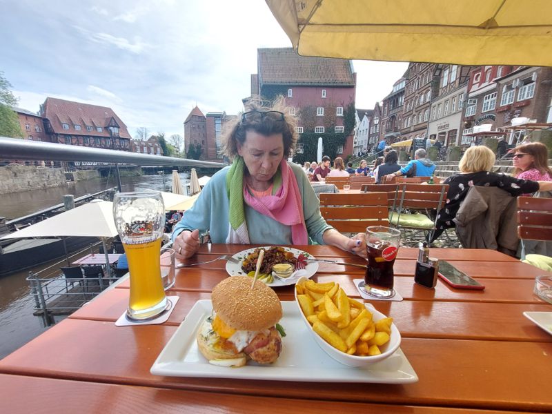 Die hübsche Innenstadt ist recht voll, es ist verkaufsoffener Sonntag. Und doch finden wir am Stintmarkt noch ein freies Plätzchen direkt am Wasser.