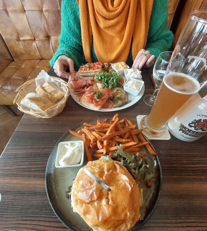 In Paula’s Brasserie gibt’s leckere Antipasti (3) und einen Burger (2-).