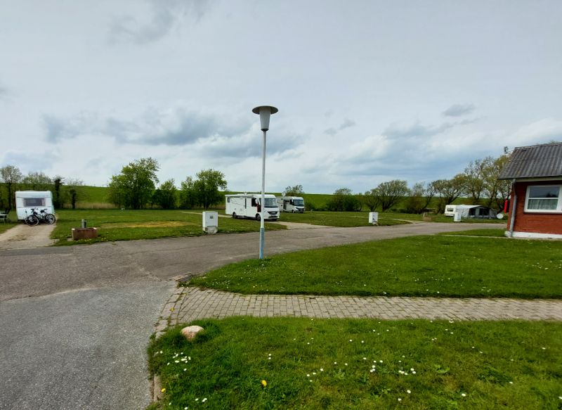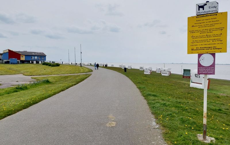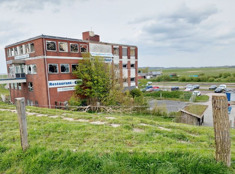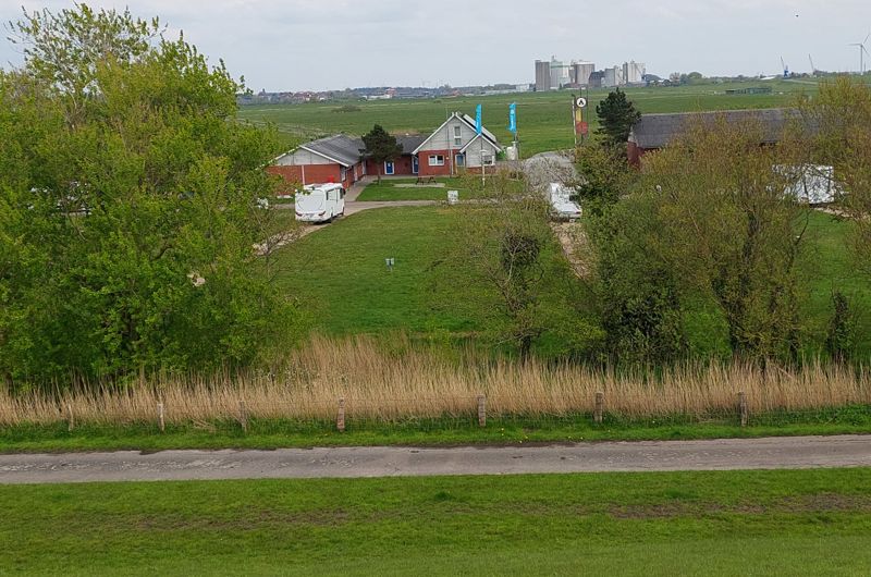 Ich radel nochmal Richtung Deich zum 4 km entfernten Campingplatz Regenbogen. Doll ist der nicht, eine Wiese mit Fahrstreifen, die Waschhäuser sind in die Jahre gekommen und das Restaurant nebenan am Deich ist abgebrannt.