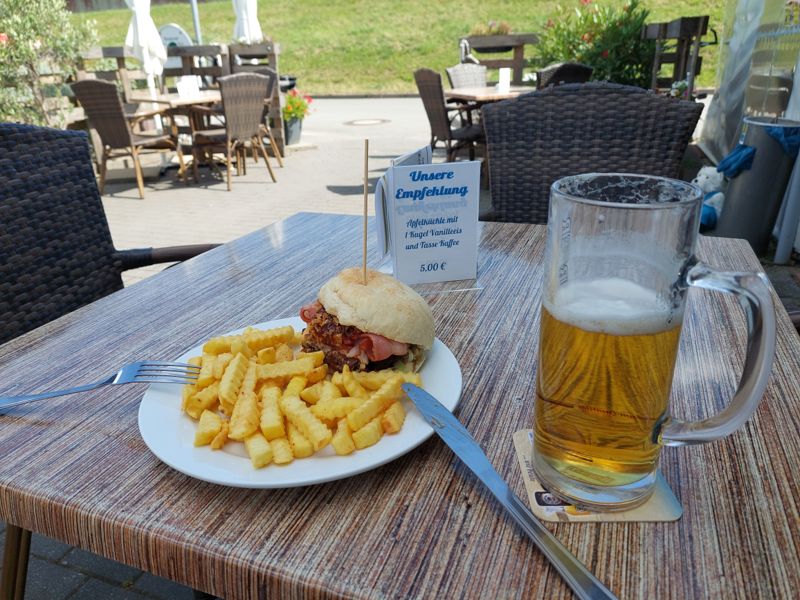 Zum Mittag probiere ich das Bistro Achtern Diek am Campingplatz aus. Früher war dies ein richtig gutes Restaurant, jetzt gibt’s nur noch Fastfood, nichts dolles, aber ganz ok.