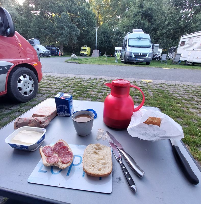 Zum Mittag fahre ich zum Griechen Nikos, das Gyros mit Leber war hervorragend, eine glatte 2. Nachmittags dann zum Grillen zu Katrin und Diggen auf den Platz.