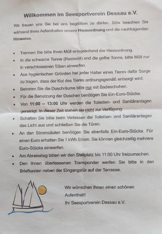 Es geht Heute doch weiter bis in den nächsten Ort, zum Stellplatz im Leopoldshafen in Dessau. Mit Fahrrad wären es etwas über 20 km gewesen, davon aber 8 km auf Kopfsteinpflaster, das muss ich nicht haben. Und der Platz ist ganz schön, schwer zu erreichen, nur über eine Fahrradstraße, was das Navi nicht wollte. Für 18,00 € kann man nicht meckern. Wo es Brötchen gibt muss ich noch erkunden.