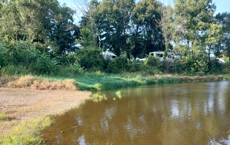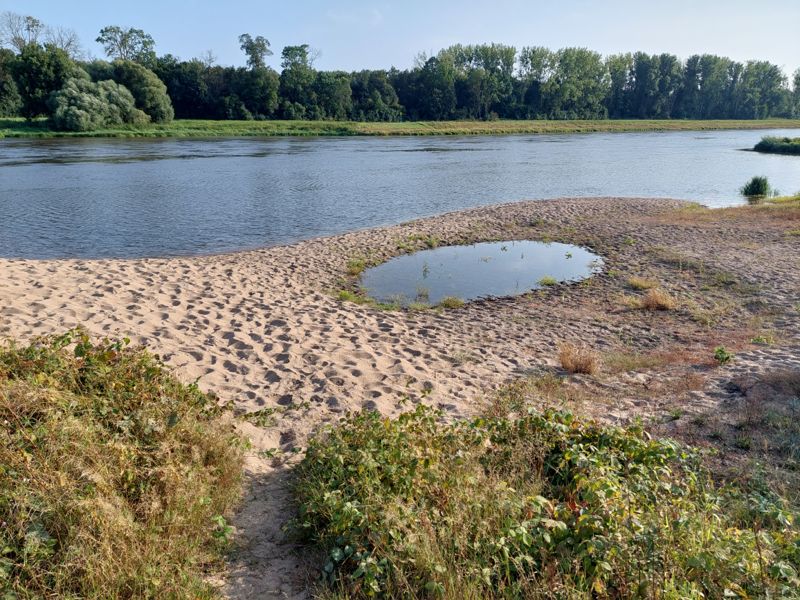 Der Stellplatz in Coswig hat doch einen Strand, aber ins Wasser wage ich mich nicht, die Strömung der Elbe und die Strudel sind mir zu doll.