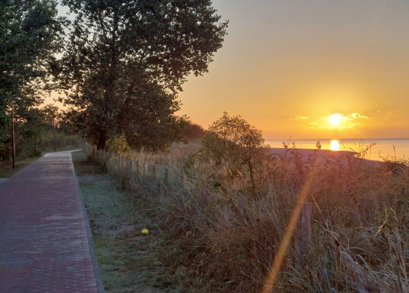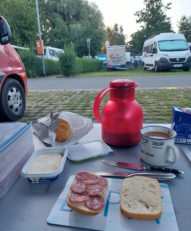 Die Sonne geht gerade auf, aber 8°C ist eindeutig zu kalt für ein Bad in den Fluten. Also los und Brötchen holen.