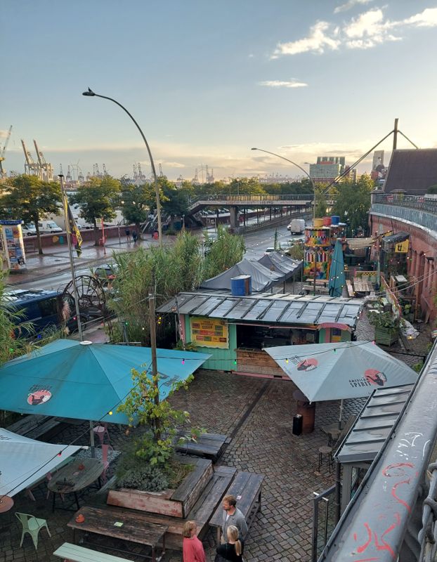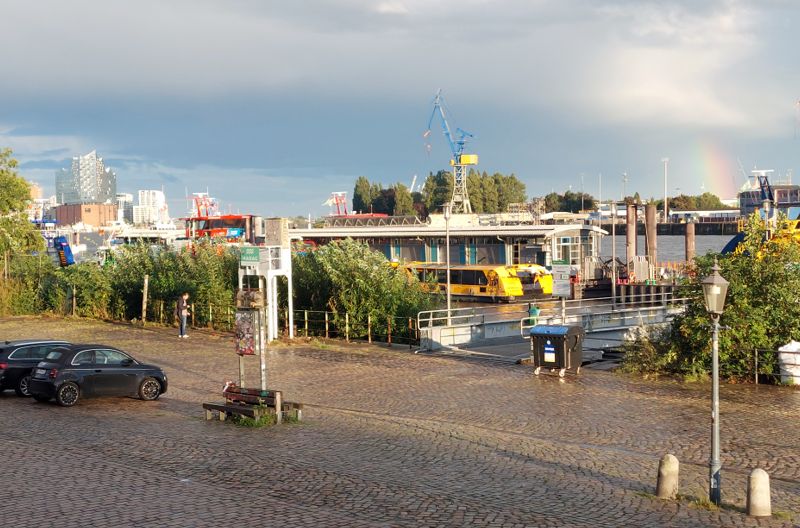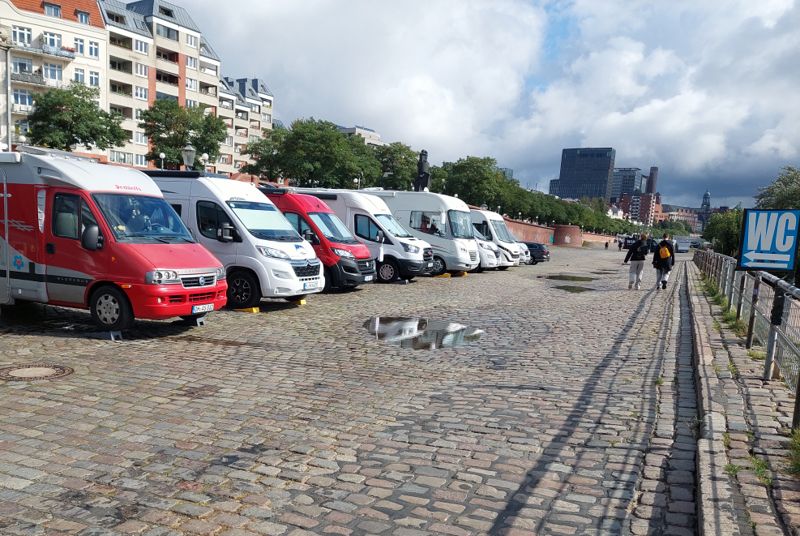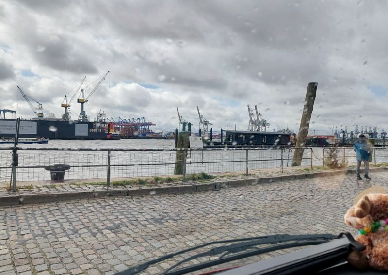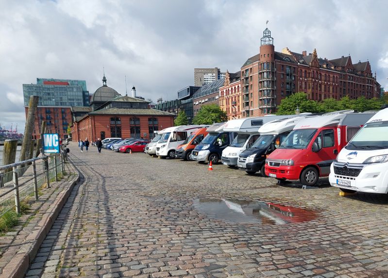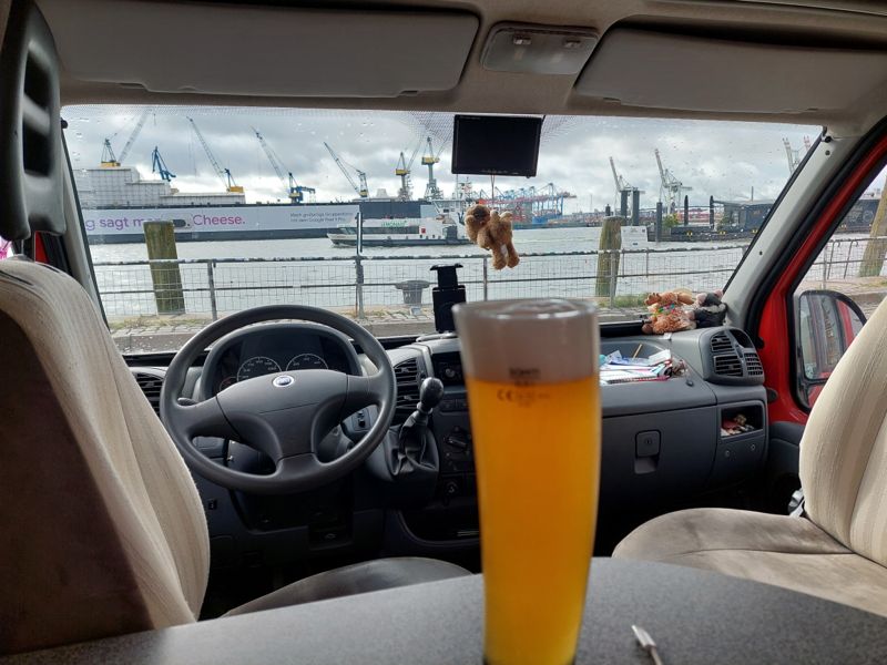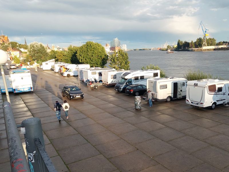 Heute Morgen war’s düster und kalt, irgendwie grault’s mir vor der dunklen Jahreszeit. Ich muss heute irgendwas machen. Es regnet zwar, aber warum nicht meine Schwester in Hamburg besuchen, ich war schon ewig nicht mehr da. Außerdem muss ich mal ausprobieren, ob man am Fischmarkt einigermaßen stehen kann. Ich komme gegen 10:30 Uhr auf dem Stellplatz an und bekomme sogar noch einen Platz in der ersten Reihe.
