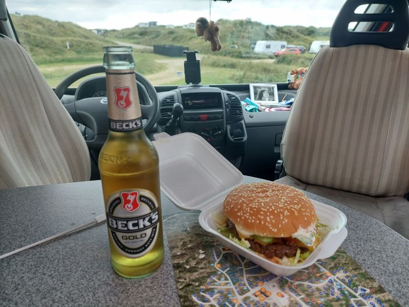Beim Frühstück überlege ich, wie’s weiter geht. Auf Amrum habe ich doch keine Lust. Auf Föhr waren wir, stink langweilig. Und Amrum hat eigentlich nur einen riesigen Badestrand, Fährzeit 1,5 Stunden hin und 1,5 Stunden zurück. Nö, lieber weiter nach DK.