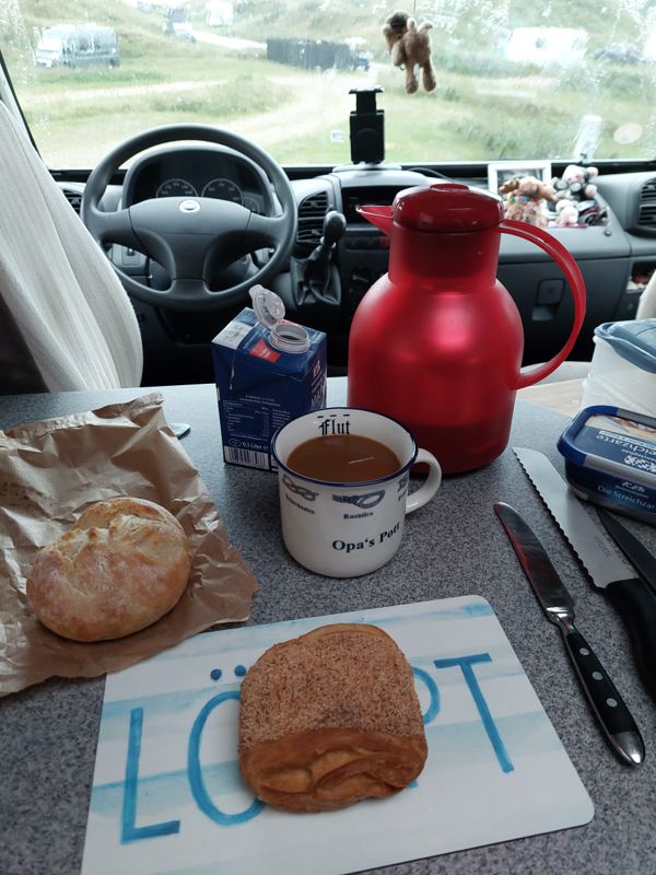 Um 07:30 Uhr hole ich Brötchen, die richtigen dänischen Birkes und Boller. Aber es nieselt, doch gegen 09:30 Uhr kommt die Sonne raus.