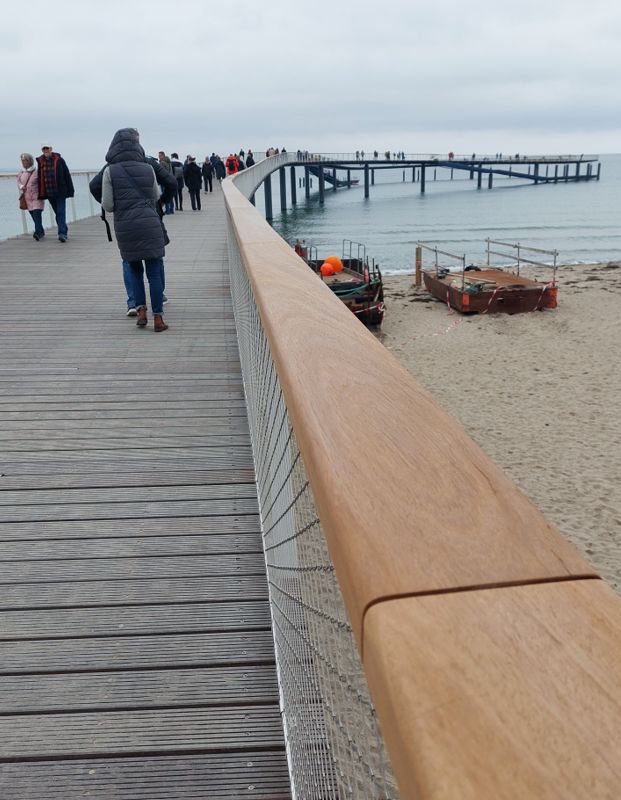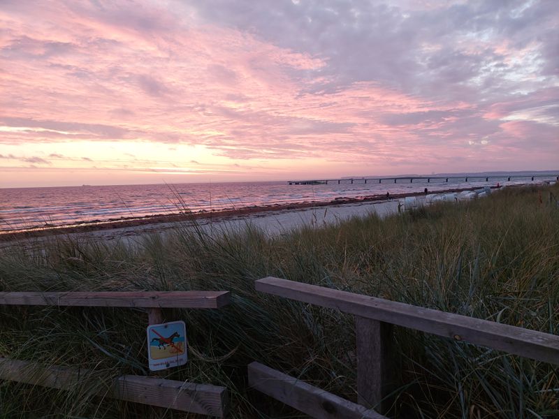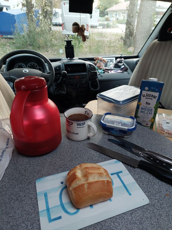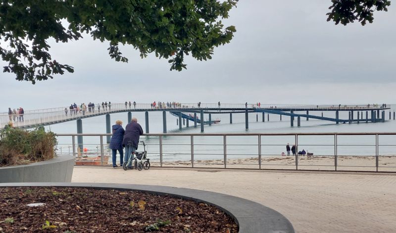 Beim Frühstücken überlege ich, wie’s weiter geht. Ich habe nicht besonders gut geschlafen, das Womo stand doch ganz schön schief. Also auf jeden Fall einen anderen Platz. Vielleicht nach Travemünde auf den Priwall, oder weiter nach Boltenhagen oder Wismar. Als ich Müll wegbringe, wird im hinteren Bereich des Stellplatzes gerade ein schöner Platz frei. Warum nicht umsetzen und hier bleiben. In der Woche ist es hier bestimmt ruhiger und ich kann ein bisschen rum dödeln und Radfahren. Und wenn’s regnet habe ich kurze Wege. Außerdem muss ich mir noch die neue Maritim Seebrücke in Timmendorfer Strand ansehen.