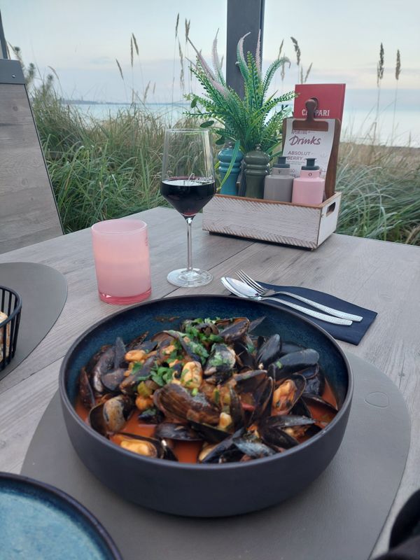 Und als ich dann zum Abendspaziergang aufbreche, steht da plötzlich ein Schild im Weg: Miesmuscheln