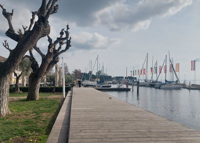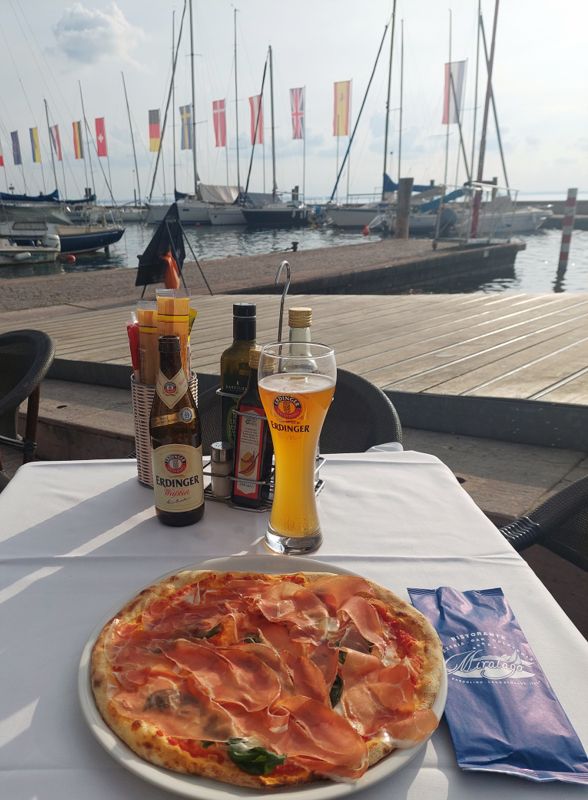 Um diese Zeit ist schön wenig los, ein paar Restaurants haben aber auf. Ich esse eine lecker Pizza mit Büffel-Mozzarella im Restaurant Bar Miralago direkt vorne am Hafenbecken. Hier ist es sonst brechend voll – und wie entspannt die Kellner noch alle sind!