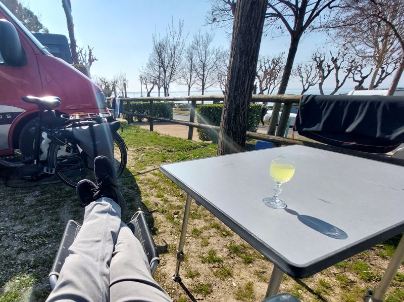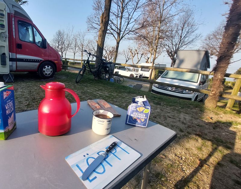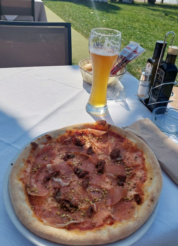 Heute Morgen ist erstmal intensive Körperpflege angesagt. Im Laufe des Tages füllt sich der Platz ganz schön. Zum Mittag geht’s in die Pizzeria auf dem Platz, meine Pizza Parma ist für einen Campingplatz ganz gut.