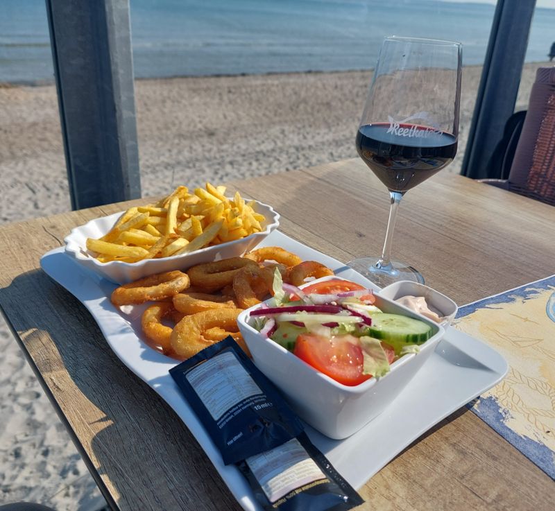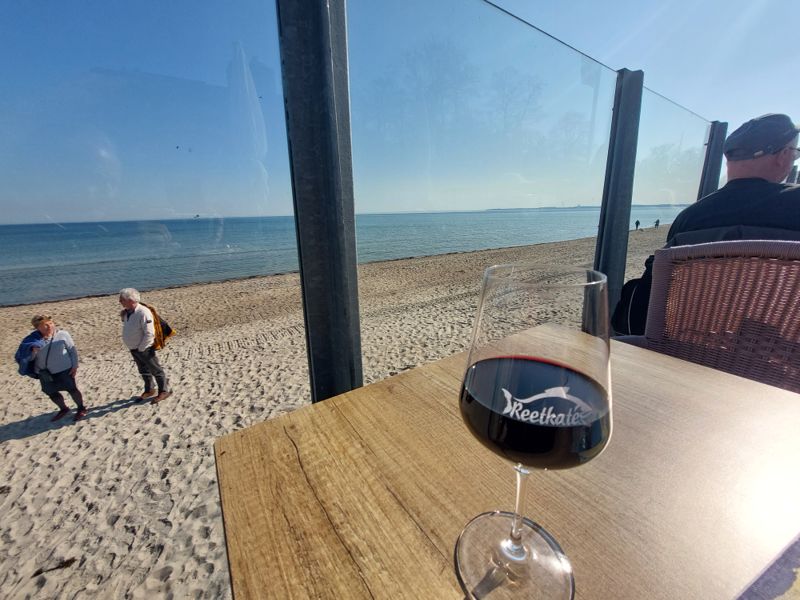 Eigentlich wollte ich mit Fahrrad nach Timmendorfer Strand, aber mir ist mehr nach chillen. Und beim schlendern am Wasser entdecke ich die Reetkate, direkt am Strand. Der Rotwein ist sehr gut und die Calamari bei der Lage ganz ok!