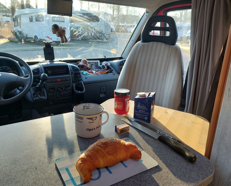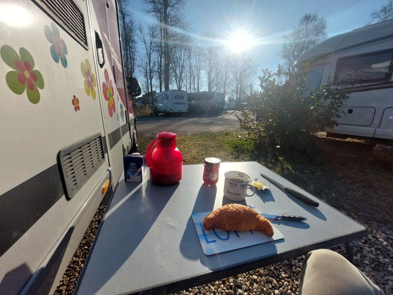 Heute ist Frühlingsanfang, kalendarisch, um 10:01 Uhr. Zum Brötchen holen muss erst das Fahrrad enteist werden. Und endlich wieder Croissants von Bäcker Brede, wie in Frankreich. Zuerst ist es zum Frühstücken draußen zu frisch, aber gegen 08:45 Uhr geht’s raus.