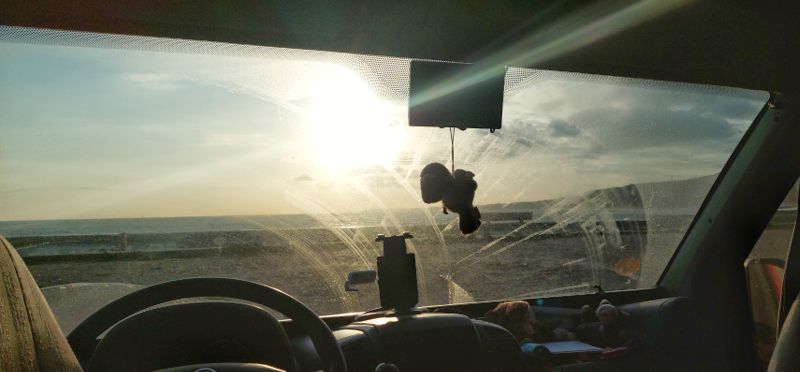 Heute Nacht hat der Wind ordentlich am Womo gerüttelt. Die Windschutzscheibe ist voll Salz.