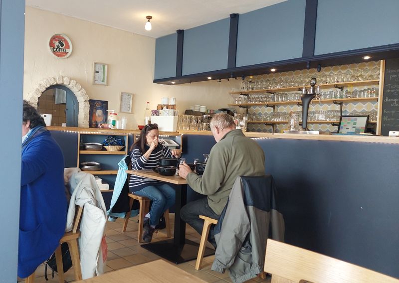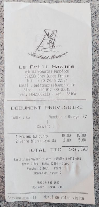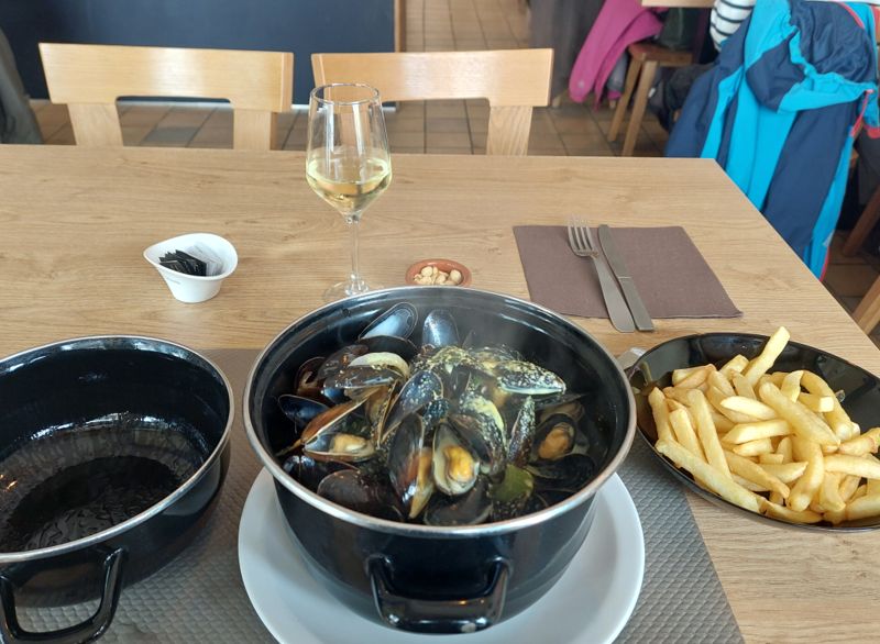 Überall Restaurants, ein paar haben schon auf, aber nur über Mittag oder am Wochenende. Ich finde eins, wo viel los ist, viele Franzosen. Die Bestellung im Le Petit Maxime mit Händen und Füßen und Google-Translater klappt und die Muscheln mit Curry sind gut.