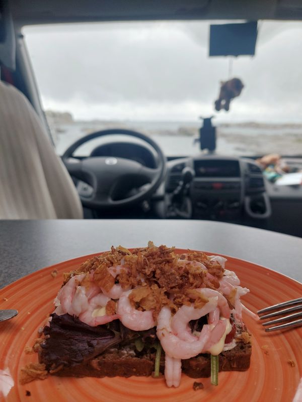 Das nächste Restaurant ist knappe 5 km entfernt. Mit dem Fahrrad dahin ist mir bei dem Wetter zu riskant. Der Weg führt über eine hohe Brücke, und das bei dem starken Wind. Also muss der Kühlschrank geplündert werden. Es gibt Smörrebröd, eins mit Roastbeef und eins mit Shrimps.