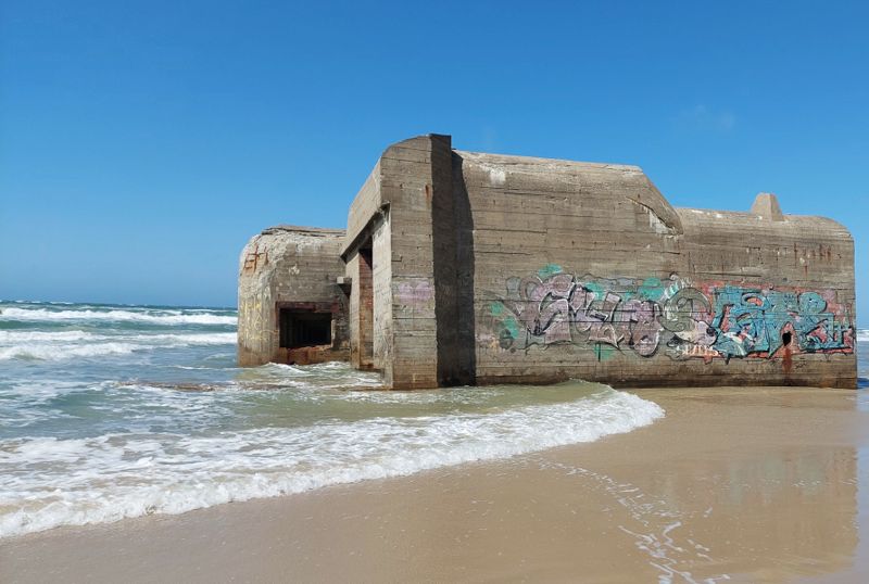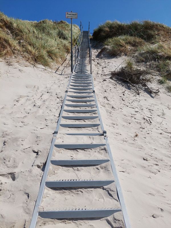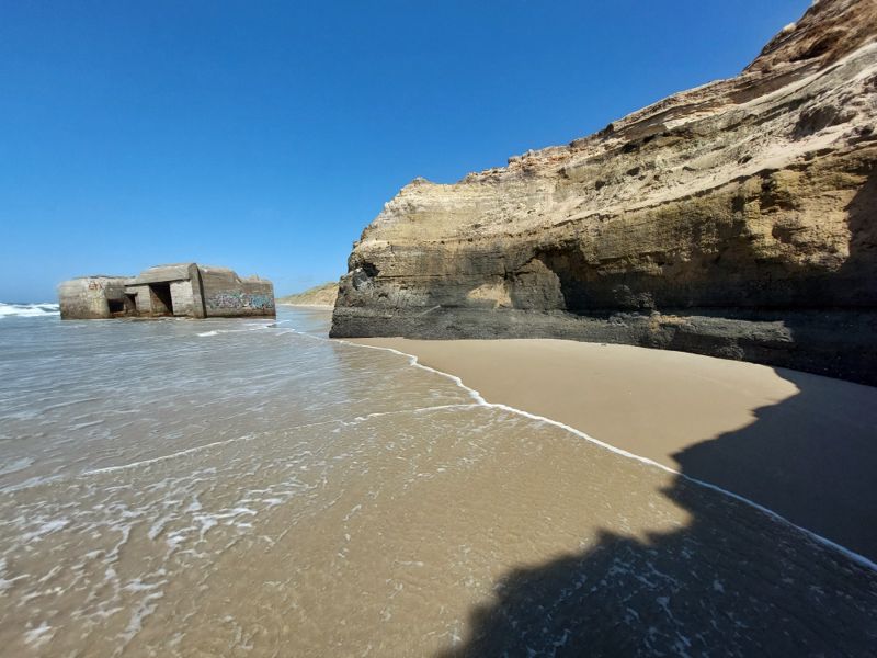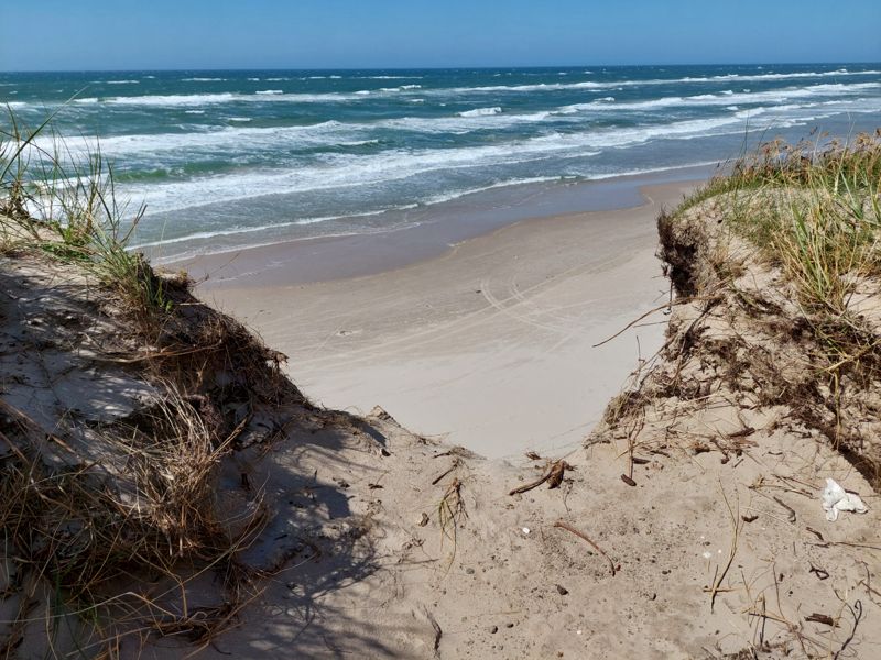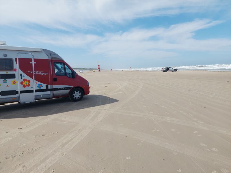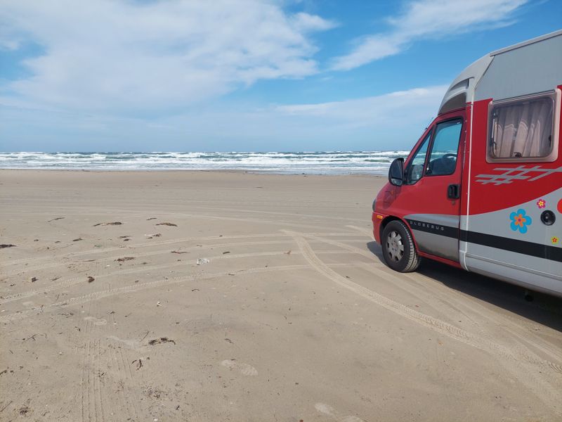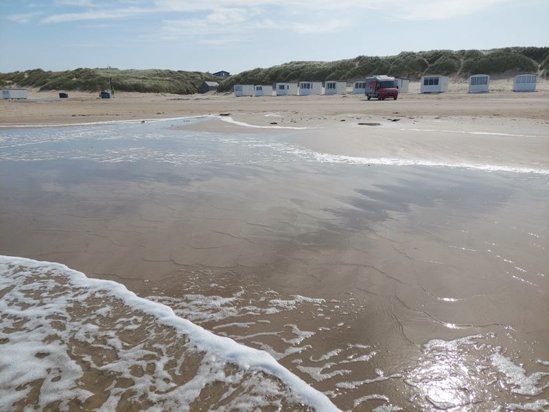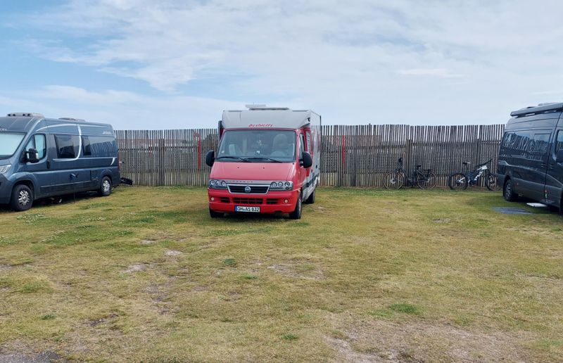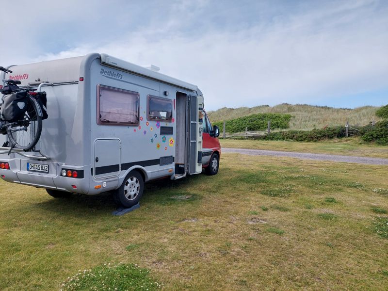 Der Campingplatz liegt direkt am Dünen Gürtel einer Steilküste. Bei Ostwind ist’s am Strand schön windstill, leider ist starker Westwind, aber dadurch total leer.