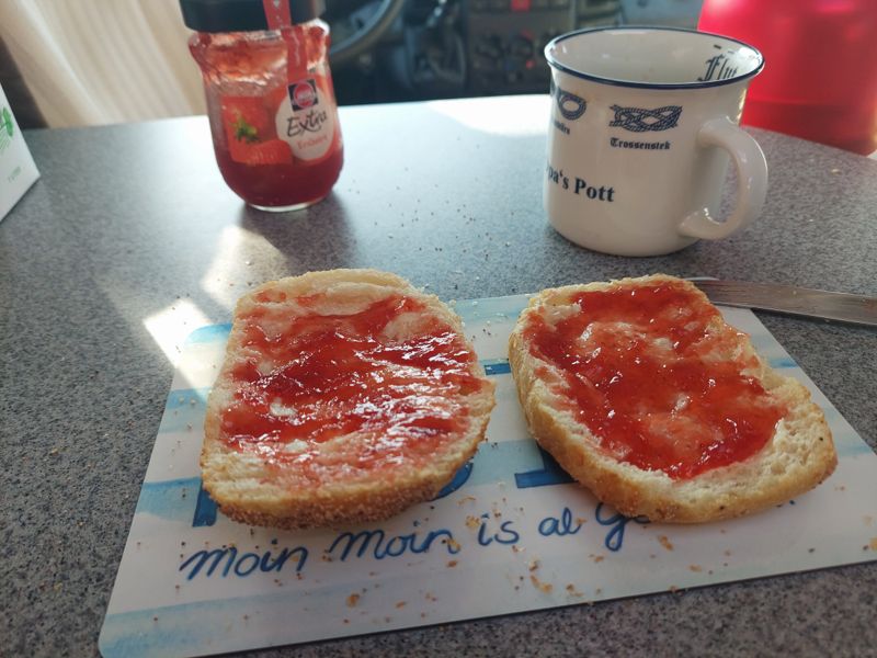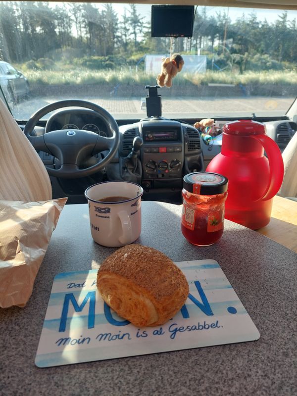 Der einzige Bäcker in Frederikshavn ist einfach zu weit weg. Dann hole ich lieber leckere Birkes Brötchen in Løkken bei Super Brugsen. Das ist zwar einmal quer rüber von der Ostsee zur Nordsee, es sind aber nur 54 km. Und dort kann ich gleich auf den Autostrand. Also entsorgen und los.