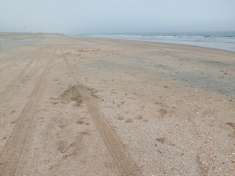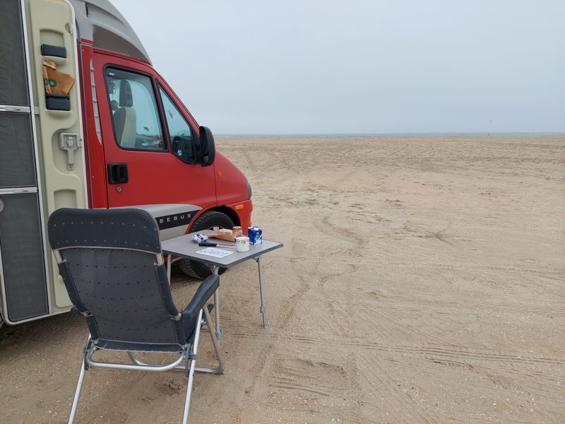 Heute Morgen ist es diesig, macht nix, gefrühstückt wird am Strand.