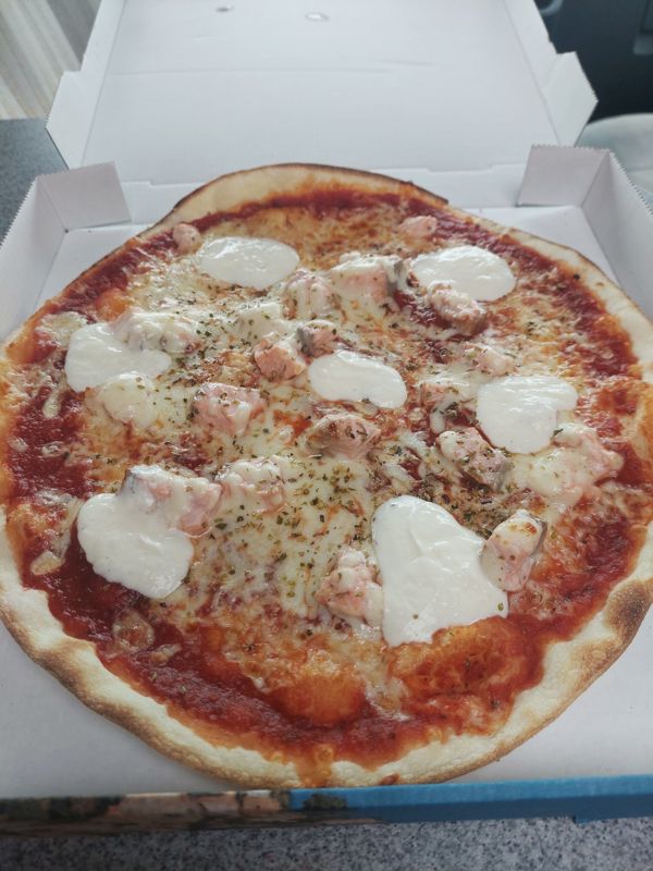 Nachmittags gibt’s eine Pizza mit Lachs und Creme Fraiche zum Mitnehmen aus der Osteria.