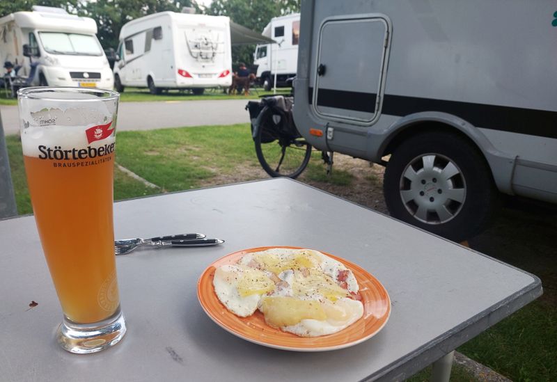 Fürs Abendessen habe ich Heißhunger auf Spiegeleier. Hier am Platz gibt es einen Eier-Automaten. Aber irgendwie weiß ich nicht, haltbar bis 09.08.25 ist ja nicht so dolle. Also aufs Fahrrad und zu Nahkauf.