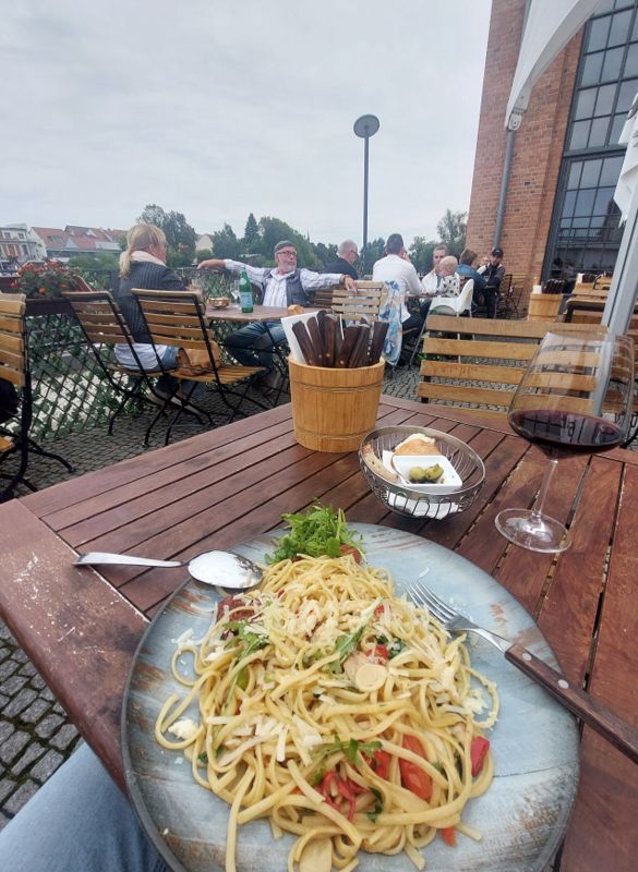 Eigentlich sollte mein erster Stop in Berlin sein, aber auch da ist alles voll, deshalb habe ich vorsichtshalber vor ein paar Tagen einen Platz in der Stadtmarina in Brandenburg an der Havel gebucht. Bevor’s zum Stellplatz geht, steuere ich unsern Lieblingsgriechen Mesogios in Brandenburg an.