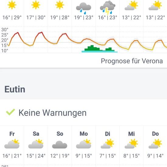 Nächste Woche soll’s etwas schlechter werden, aber immer noch einigermaßen warm. Ich habe einfach mal in Bibione für 3 Tage gebucht, da standen wir vor vielen Jahren schon einmal bei Gewitter.
