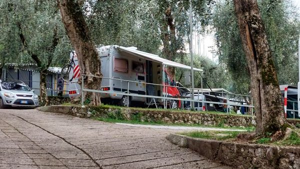 Erst schreckt mich die schmale und sehr steile Auffahrt ab, aber ich wage es und werde mit dem wohl bisher besten Campingplatz am Gardasee belohnt. Der Platz ist einfach nur kuschelig, sehr liebevoll terrassenförmig in einem Olivenhain angelegt. Alle Plätze haben zumindest ein Bisschen Seeblick. Und die Terrasse der platzeigenen Bar hat einen sensationellen Ausblick. Aperol Spritz 4,50 €, für den Platz 25,00 €. Da alles sehr schwierig zu befahren ist, wird man vom Eigentümer persönlich eingewiesen.