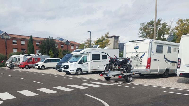 Ein einfacher Parkplatz, eng aber stadtnah. 72 Stunden darf man hier kostenlos stehen. Strom gibt es für 1,- € einmalig für 2 Stunden. Man muss aber rechtzeitig auf dem Stellplatz sein, ab Mittag wird’s langsam voll.