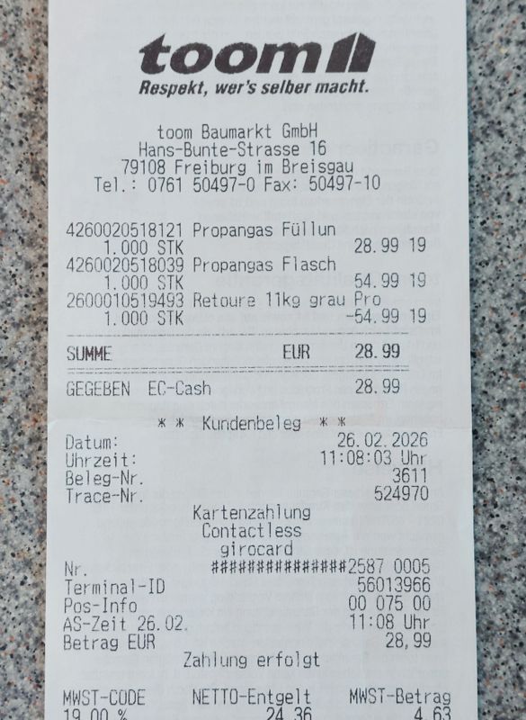 Eigentlich wollte ich auf den Stellplatz in Freiburg. Der liegt gleich neben dem Europapark Stadion des SC Freiburg und ist auch bei Heimspielen für Womos gesperrt. Der Platz ist mir aber zu steril. Außerdem ist mir Freiburg zu groß und zu wuselig, gestern Heidelberg war schon grenzwertig. Deshalb geht’s nur tanken und zum Toom Baumarkt, die Gasflasche tauschen.