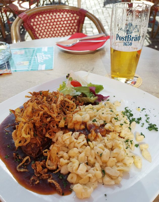 Im Restaurant Am Kreuzplatz gibt’s Schwäbischen Zwiebelrostbraten mit Spätzle.