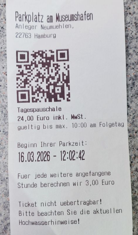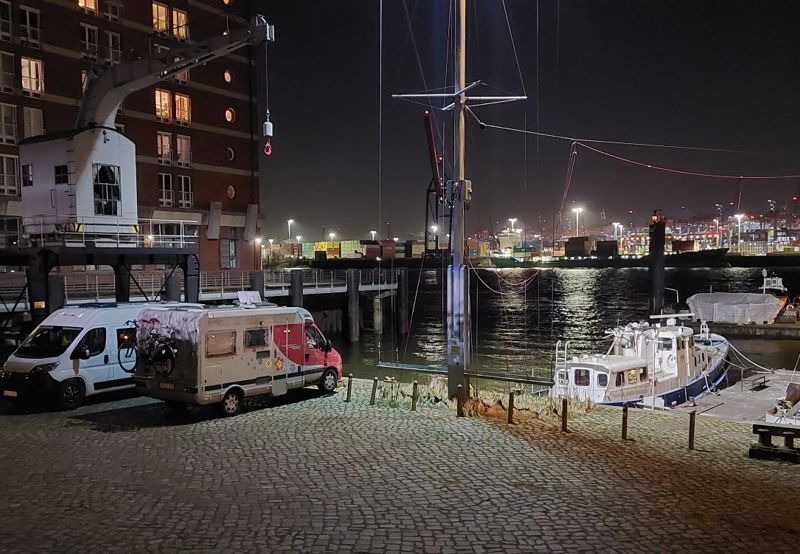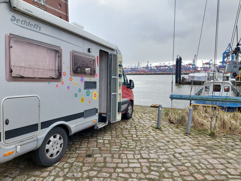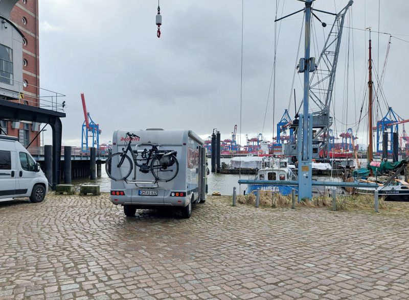 Gestern Nachmittag hatte ich mit dem Museumshafen in Övelgönne telefoniert, dort zu stehen wäre am Montag kein Problem. Und tatsächlich kann ich dort direkt am Wasser mit meinem Womo parken.