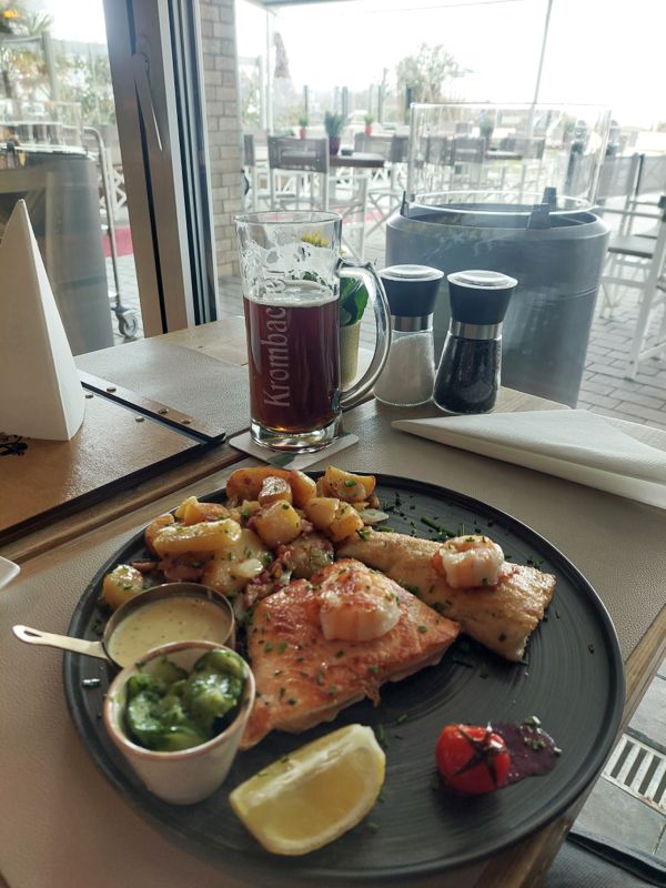 Mittag gibt’s im Fisch & Meer, die Fischplatte ist sehr lecker, die Bratkartoffeln kross und köstlich.