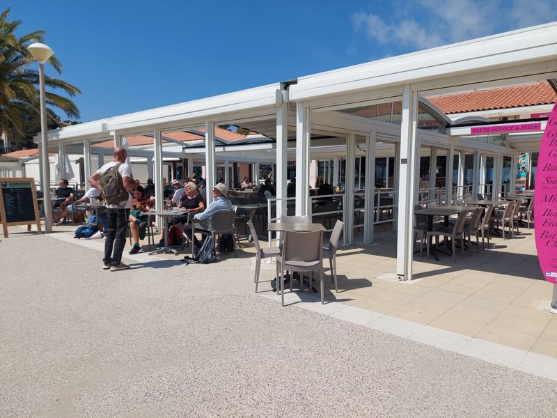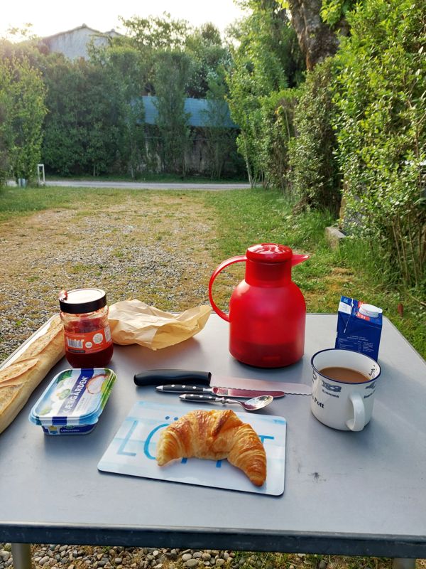 Von den gut 10 Restaurants hier in Carro habe ich mir 2 rausgesucht. Aber denkste, alle haben noch dicht, hier ist noch tote Hose, obwohl der Stellplatz gerammelt voll ist. Geöffnet hat nur eine Boulangerie und ein kleiner Supermarkt, der hat aber nichts zum Grillen, wahrscheinlich leer gekauft. Also erstmal nur einen kleinen Snack.