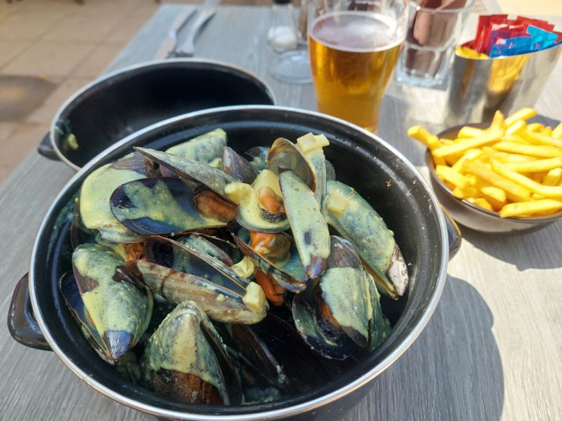 Dann schwinge ich mich doch nochmal auf’s Rad, hier muss doch irgendwo was los sein. Gleich um die Ecke ist ein großer Badestrand Plage la couronne mit einer kleinen Promenade. Da bekomme ich im Restaurant U Spuntinu sehr leckere Moules Au Roquefort.