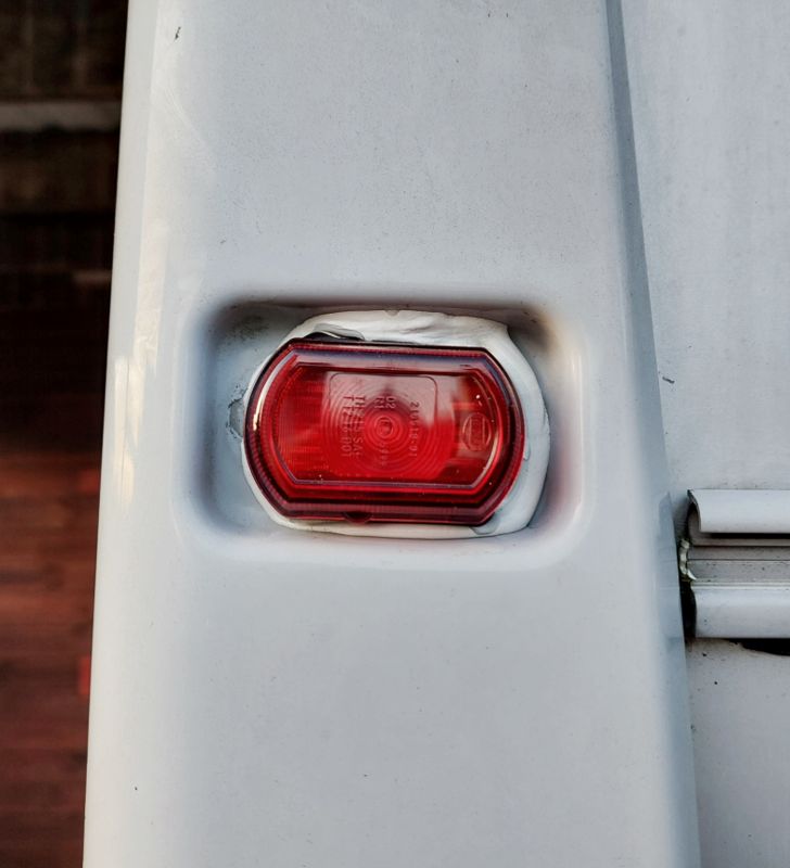 Nach fast 10 Jahren macht die eine hintere Umrissleuchte schlapp, sie glimmt nur noch leicht. Leider gibt es diese LED-Leuchten zum Schrauben nur noch beim Chinesen. Von namhaften Herstellern gibt es sie nur noch zum Kleben. Also 2 neue Leuchten von Hella, eine Tube Dekaseal 8936 und schön suppschich eingesetzt.